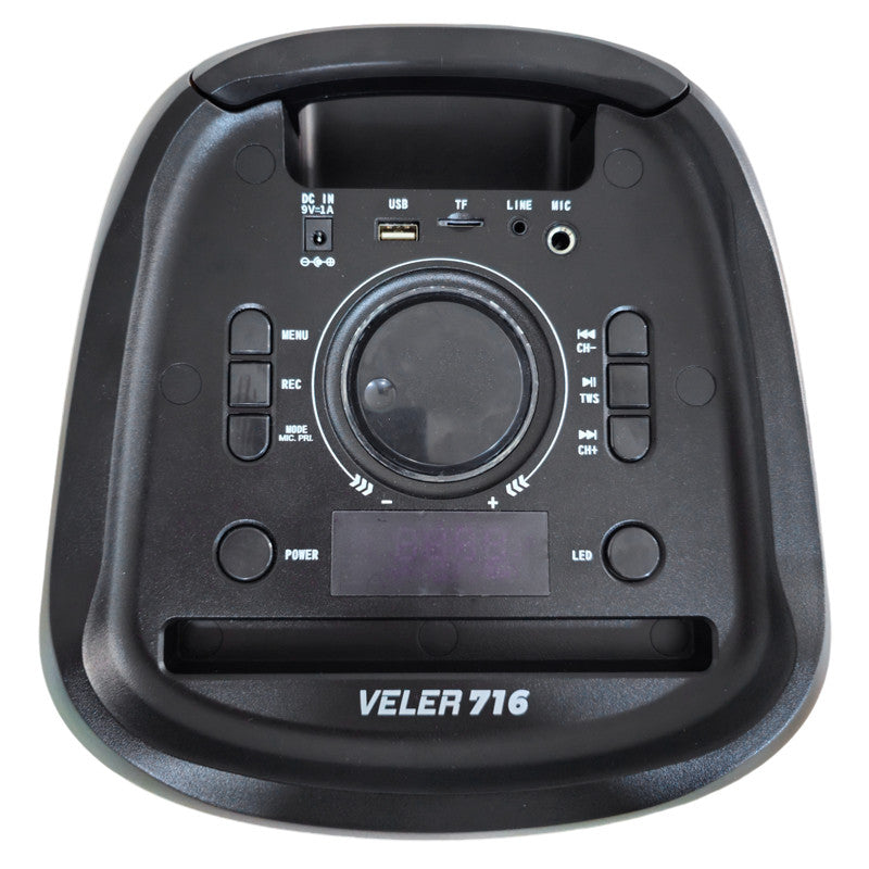 Le VELER-716 est bien plus qu’un simple haut-parleur : c’est un système audio complet avec micro sans fil, fonction karaoké, effets lumineux LED et roues intégrées pour un transport facile.