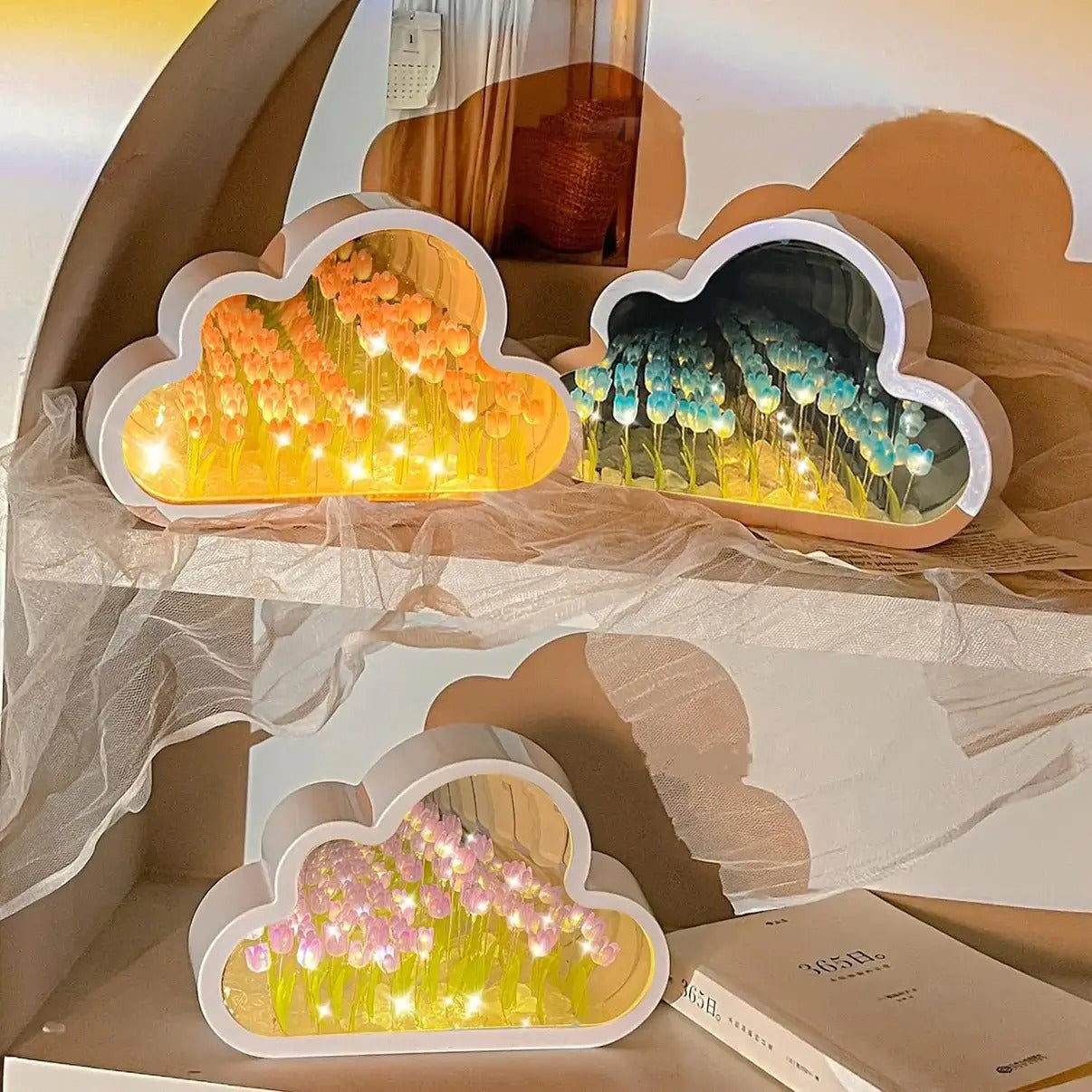 Un miroir qui dépasse l'ordinaire – notre Cloud Mirror est une œuvre d'art visuelle. Allumez les lumières LED et laissez les tulipes à l'intérieur créer une illusion d'infini, transformant chaque pièce en un véritable paradis floral.
